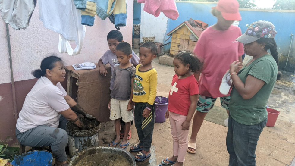 Gemeinsam mit den Kindern wird Öko-Kohle für den Eigenbedarf produziert. Dafür werden Kohlereste mit Maniokmehl und Tonerde vermischt. (Man suche die entsprechenden Bilder in der Galerie - die Schuldirektorin ist dabei selbst am Werk.)
